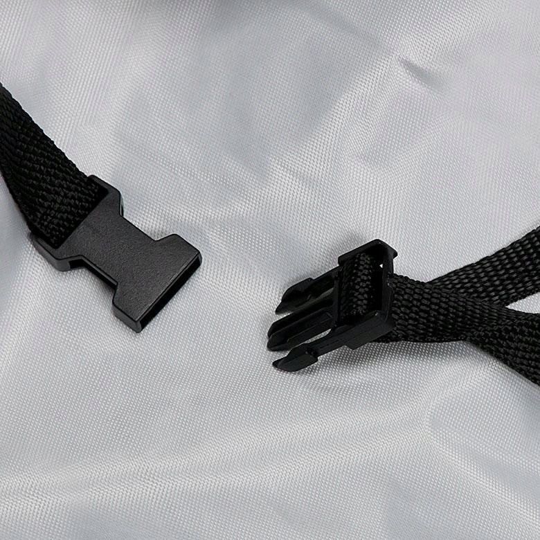 Na dole znajdują się ściągacze oraz pasek z klamrą do spięcia pod motocyklem. Dodatkowo pokrowiec posiada dwa otwory umożliwiające założenie blokady na koło motocykla.