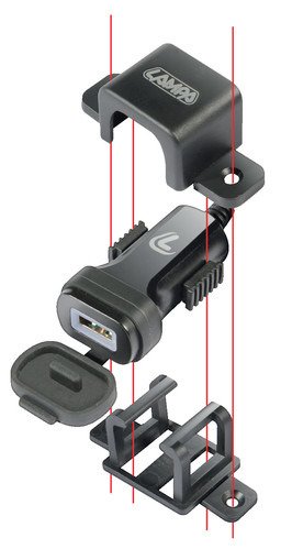 Kompaktowa konstrukcja. Śruby lub mocowanie dwuskładnikowe (w zestawie). Przewód z zaciskami widełkowymi. Ładowarka USB z inteligentnym układem, który rozpoznaje podłączone urządzenie i dostarcza odpowiedni prąd do bezpiecznego i szybkiego ładowania. Ochrona przed zwarciem, przegrzaniem, przeciążeniem.