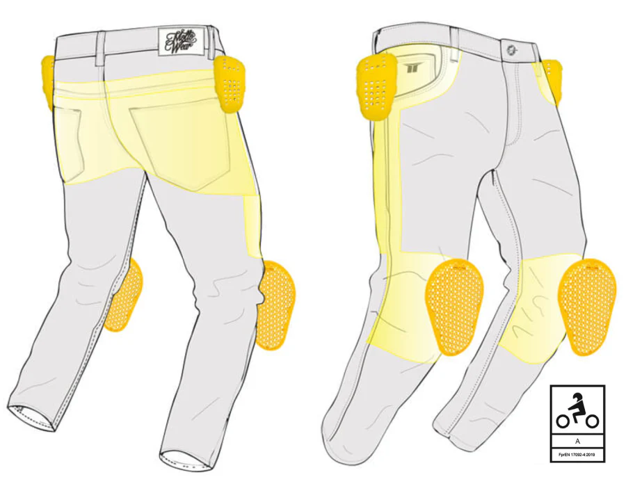 Możesz dokupić do nich także biodrowe ochraniacze, które umieścisz w specjalnych kieszonkach lub za pomocą specjalnych rzepów. Ochraniacze są wysokiej jakości i oczywiście posiadają certyfikaty, wykorzystują technologię SAFE-TECH®. Wszystkie wzmocnienia spodni wykonane są z 100% oryginalnego DuPont™ Kevlar® chronią tyłek, biodra, uda i kolana.