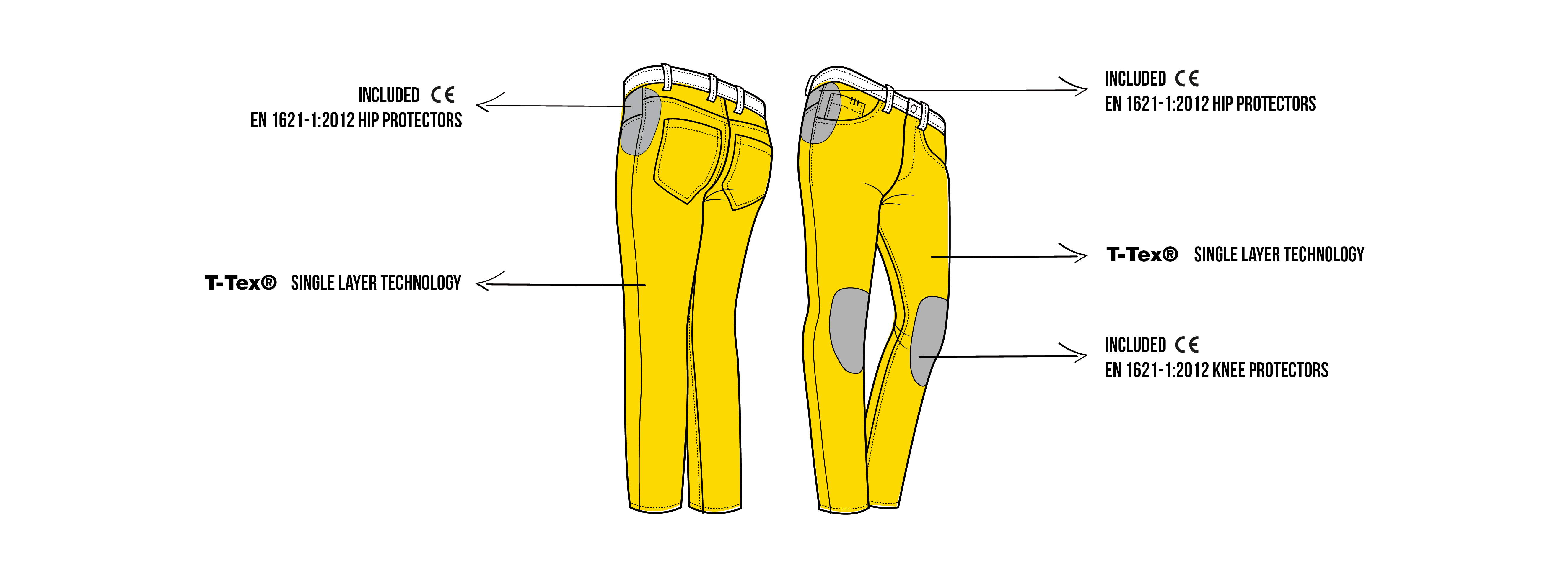 Tylko 25% motocyklistów nosi spodnie ochronne, które pomogą uratować nogi podczas upadku. Większość urazów kończyn dolnych podczas upadku to otarcia i rany szarpane. Technologia PMJ jest odpowiedzią na ten problem bezpieczeństwa. Dżinsy PMJ są dostarczane z ochraniaczami Omologate CE 1621-1. Te protektory są wykonane z materiału termoplastycznego o dużej gęstości, wyprodukowanego we Włoszech i testowanego w różnych temperaturach (+/- 20 °). Ten rodzaj ochrony uzyskał bardzo niską wartość siły resztkowej 16,2Kn. Ochraniacze mają anatomiczny kształt i idealnie dopasowują się do części ciała, które należy chronić podczas uderzenia.