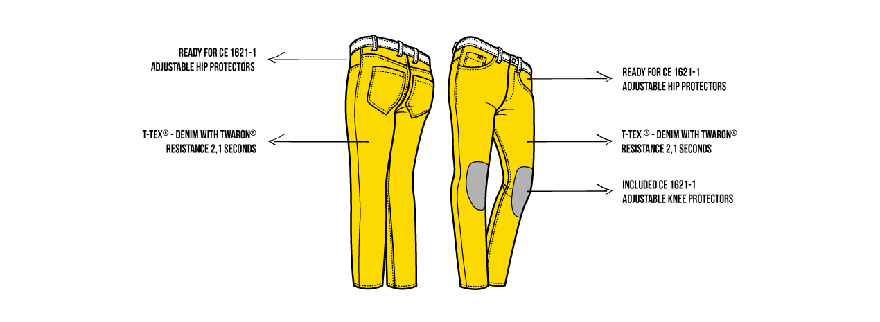 Tylko 25% motocyklistów nosi spodnie ochronne, które pomogą uratować nogi podczas upadku. Większość urazów kończyn dolnych podczas upadku to otarcia i rany szarpane. Technologia PMJ jest odpowiedzią na ten problem bezpieczeństwa. Dżinsy PMJ są dostarczane z ochraniaczami Omologate CE 1621-1. Te protektory są wykonane z materiału termoplastycznego o dużej gęstości, wyprodukowanego we Włoszech i testowanego w różnych temperaturach (+/- 20 °). Ten rodzaj ochrony uzyskał bardzo niską wartość siły resztkowej 16,2Kn. Ochraniacze mają anatomiczny kształt i idealnie dopasowują się do części ciała, które należy chronić podczas uderzenia.