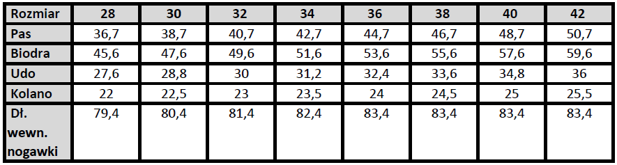 - Zakres rozmiarów: 28 (42) do 44 (58)
