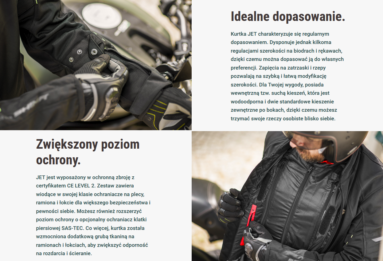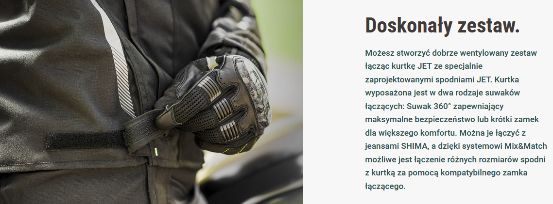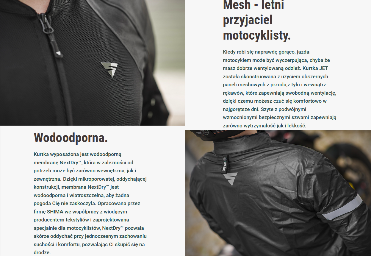 JET to letnia kurtka wykonana z przewiewnej tkaniny mesh zaprojektowana dla amatorów jazdy po mieście, a także osób lubiących niedalekie wypady. Dzięki obszernym panelom wentylacyjnym zapewnia wysoki poziom przepływu powietrza, gwarantując maksymalną wentylację nawet w najbardziej gorące dni. Model ten jest wyposażony w wypinaną wodoodporną membranę NextDry™ do użytku wewnętrznego lub zewnętrznego. W przypadku deszczu lub zimnego wiatru można nałożyć wodo- i wiatroszczelną membranę NextDry™ także na wierzch. Wyposażona w system certyfikowanych protektorów poziomu 2 CE zapewnia podwyższone bezpieczeństwo, podniesione dodatkowo przez odporną na ścieranie tkaninę wzmacniającą obszary łokci i ramion. Do tej kurtki możesz idealnie dopasować jeansy SHIMA lub specjalnie zaprojektowane przewiewne spodnie JET z tej samej serii. Dzięki dwóm różnym zamkom łączącym z łatwością zepniesz kurtkę z wybranymi spodniami. Dyskretnie umieszczone panele odblaskowe zapewnią że zostaniesz zauważony nawet w dni o obniżonej widoczności.
